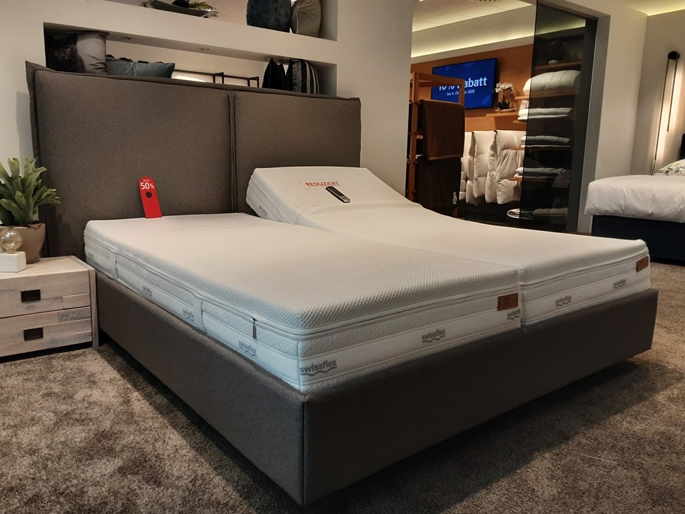 Größe: 180/200 cm | Material: Polster, Stoff in Farbe Grau | Kopfteilhöhe: 135 cm | inklusive Unterfederungen Swissflex: 1x SF 22_95 Bridge (4 Motoren) und 1x SF 22_05 (nicht verstellbar) | inklusive Swissflex Matratzen: 1x Versa Hybrid 24 Gomtex in Soft und 1x in Medium | Firma: Swissflex